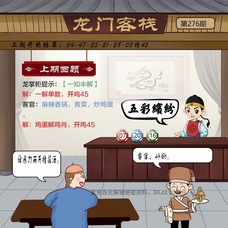 第276期掌柜:五彩繽紛 解:各种颜色交织在一起,非常绚丽的意思。 小二:客官,好的。 解:无。 客官:给我打两斤桂花酒。 解:两斤解双数的生肖龙、虎、鼠、狗、猴、马。 推荐九肖:龙牛虎鼠马鸡兔猪狗 推荐六肖:龙牛虎鼠马鸡 |