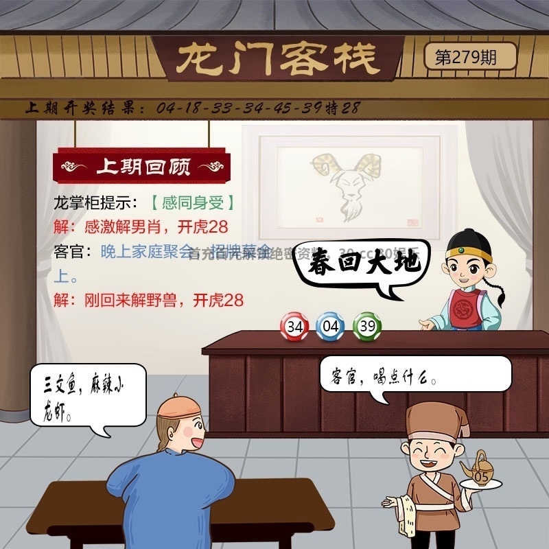 第279期掌柜:春回大地 解:指严寒过后温暖和生机重临人间。 小二:客官,喝点什么。 解:无。 客官:三文鱼,麻辣小龙虾。 解:小龙虾解小肖的生肖鼠、兔、龙、蛇、猴、鸡。 推荐九肖:羊鸡兔虎狗猴龙蛇马 推荐六肖:羊鸡兔虎狗猴 推荐三肖:羊鸡兔 |