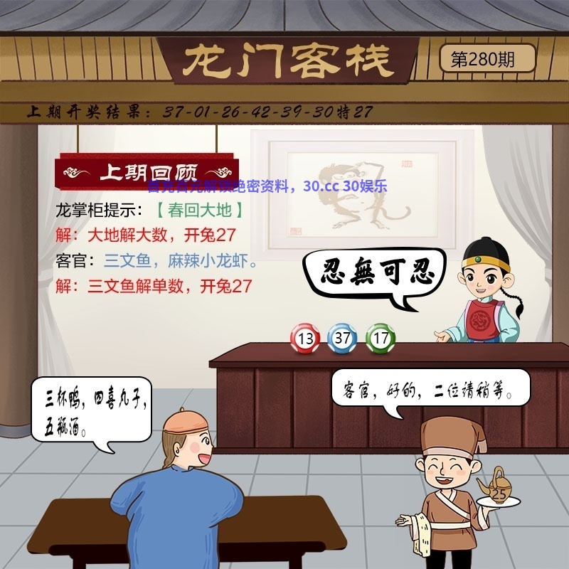 第280期掌柜:忍無可忍 解:字面指忍耐达到极限而无法继续。 小二:客官,好的,二位请稍等。 解:无。 客官:三杯鸭,四喜丸子,五瓶酒。 解:鸭子解家禽的生肖牛、马、羊、鸡、狗、猪。 推荐九肖:鼠马龙猴兔虎羊牛猪 推荐六肖:鼠马龙猴兔虎 推荐三肖:鼠马龙 |